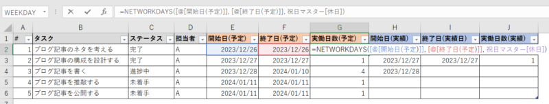 =NETWORKDAYS([@[開始日(予定)]], [@[終了日(予定)]], 祝日マスター[休日])