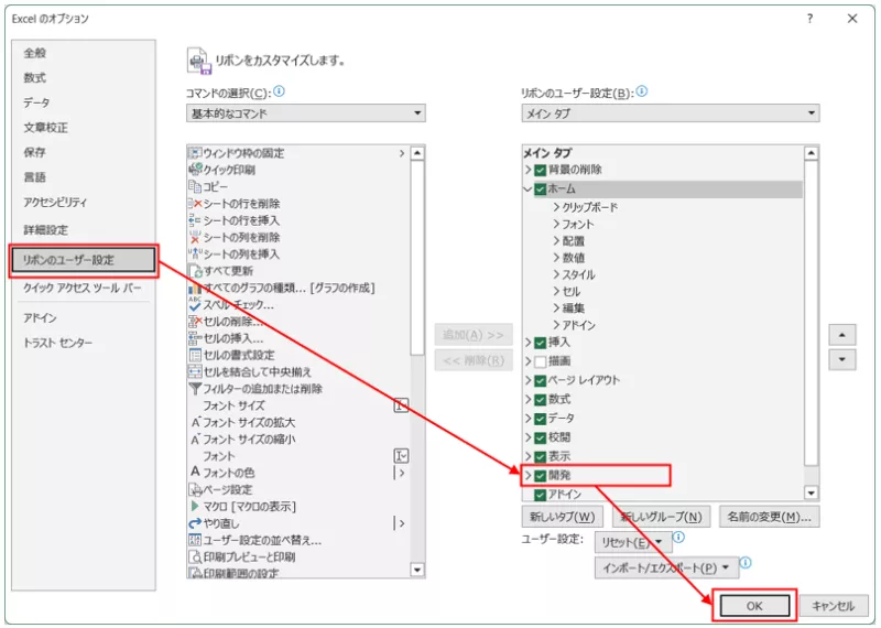 - 3Excelのオプション画面で「リボンのユーザー設定」メニューをクリックし、「開発」にチェックを入れて最後に「OK」ボタンをクリックする